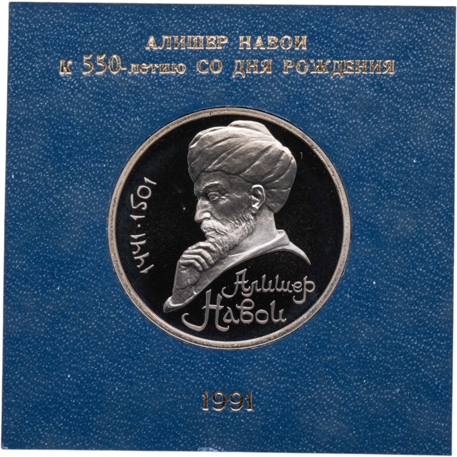 В центре портрет А. Навои. Слева от него вдоль внешнего ободка монеты полукругом приведены годы жизни поэта «1441» и «1501», разделенные точкой. Под портретом в две строки надпись «АЛИШЕР НАВОИ».
