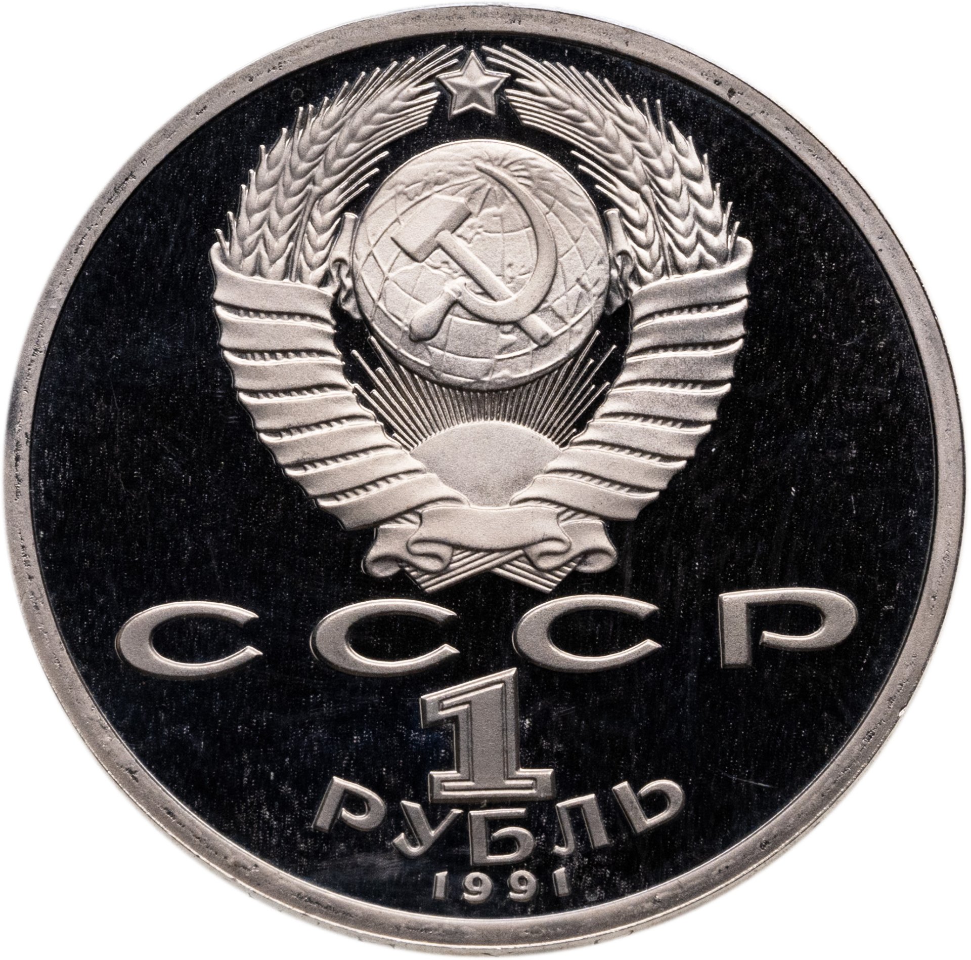 Сверху герб СССР с 15 витками ленты, под ним буквы «СССР», ниже обозначение достоинства монеты цифра «1» и ниже слово «РУБЛЬ», внизу у канта год выпуска монеты «1991».