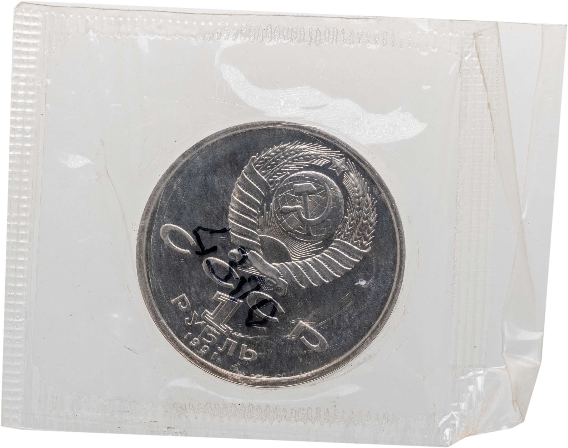 Сверху герб СССР с 15 витками ленты, под ним буквы «СССР», ниже обозначение достоинства монеты цифра «1» и ниже слово «РУБЛЬ», внизу у канта год выпуска монеты «1991».