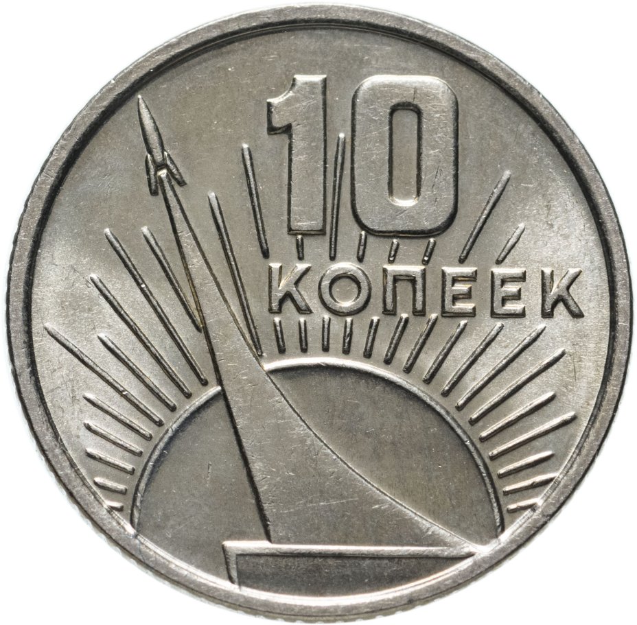 Посвященная годовщине Советской власти, она отражает важнейшее достижение нового государства – покорение космоса. Большую часть плоскости реверса занимает восходящее солнце, обрамленное лучами. На его фоне на первом плане изображен монумент Покорителям космоса, установленный в Москве 4 ноября 1964 года. Изначально памятник планировали посвятить успешному запуску в 1957 году Спутника 1, однако, к моменту установки монумента Юрием Гагариным уже был совершен первый полет в космос, поэтому посвящение монумента изменили. Монумент, в основу которого положено абстрактное решение, представляет собой изогнутую параболу, символизирующую шлейф от ракеты, установленной на самой ее вершине. В правой части реверса – размещен, расположенный в две строчки номинал монеты – 10 копеек.