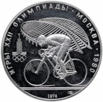 Слева и сверху вдоль канта слова «ИГРЫ XXII ОЛИМПИАДЫ», справа разделенные точкой слово «МОСКВА» и год проведения XXII Олимпиады «1980», слева эмблема XXII Олимпийских игр, в середине велосипедист, за ним велотрек в Крылатском, под велосипедистом справа монограмма монетного двора «ЛМД», внизу у канта год выпуска монеты «1978».