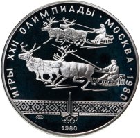 Слева и сверху вдоль канта слова «ИГРЫ XXII ОЛИМПИАДЫ», справа разделенные точкой слово «МОСКВА» и год проведения XXII Олимпиады «1980», в середине две оленьи упряжки соревнуются в гонке, ниже узорчатая полоса и в ее середине эмблема XXII Олимпийских игр, ниже слева монограмма монетного двора «ЛМД», внизу у канта в центре год выпуска монеты «1980».