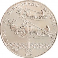 Слева и сверху вдоль канта слова «ИГРЫ XXII ОЛИМПИАДЫ», справа разделенные точкой слово «МОСКВА» и год проведения XXII Олимпиады «1980», в середине две оленьи упряжки соревнуются в гонке, ниже узорчатая полоса и в ее середине эмблема XXII Олимпийских игр, ниже слева монограмма монетного двора «ЛМД», внизу у канта в центре год выпуска монеты «1980».