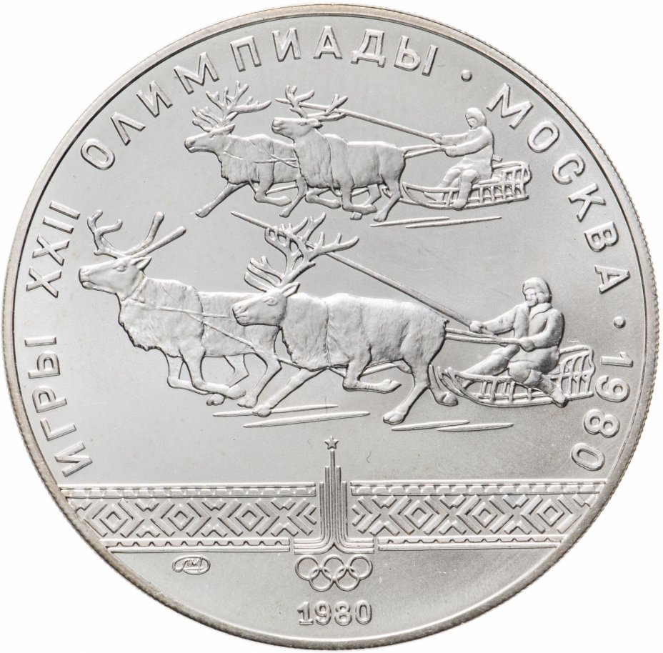 Слева и сверху вдоль канта слова «ИГРЫ XXII ОЛИМПИАДЫ», справа разделенные точкой слово «МОСКВА» и год проведения XXII Олимпиады «1980», в середине две оленьи упряжки соревнуются в гонке, ниже узорчатая полоса и в ее середине эмблема XXII Олимпийских игр, ниже слева монограмма монетного двора «ЛМД», внизу у канта в центре год выпуска монеты «1980».