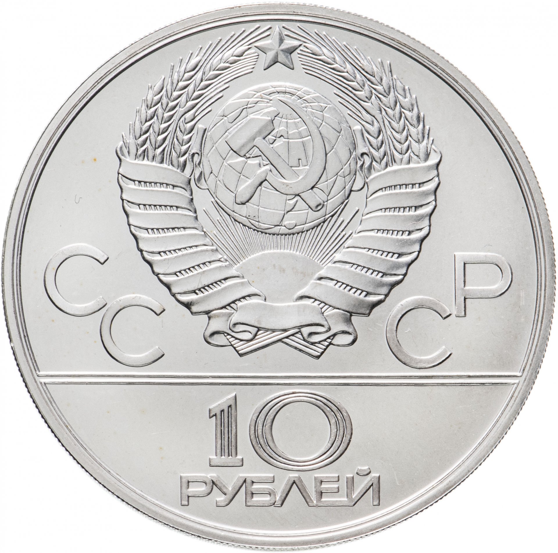 Сверху герб СССР с 15 витками ленты, слева от него буквы «СС», справа «СР», ниже двойная черта, под ней обозначение достоинства монеты цифра «10» и ниже слово «РУБЛЕЙ».