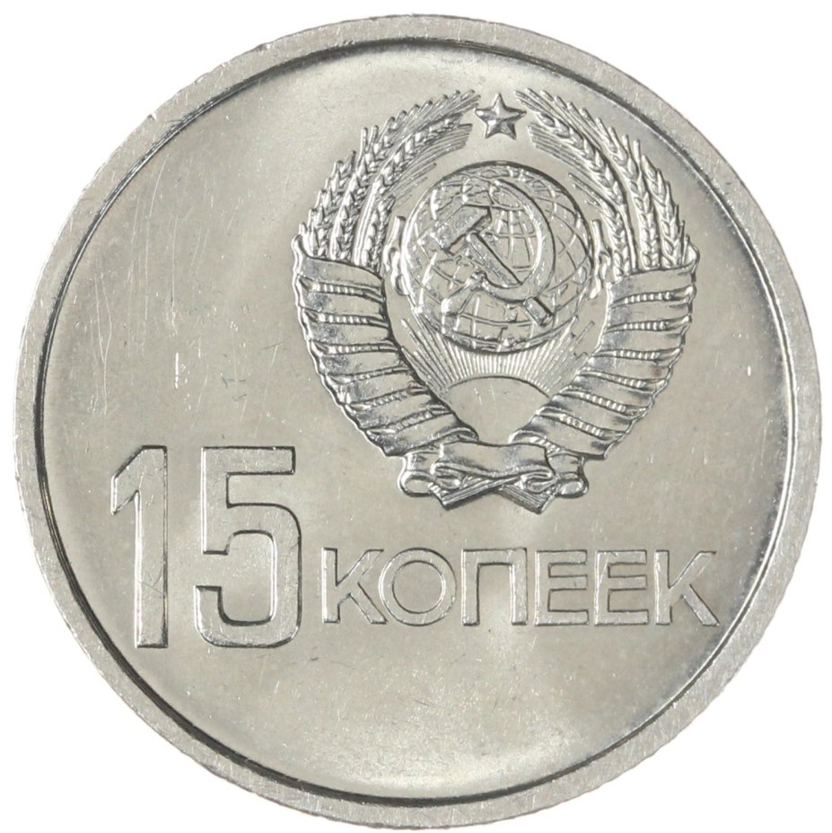 Сверху смещенный вправо герб СССР с 15 витками ленты, под ним обозначение достоинства монеты «15» и правее слово «КОПЕЕК».