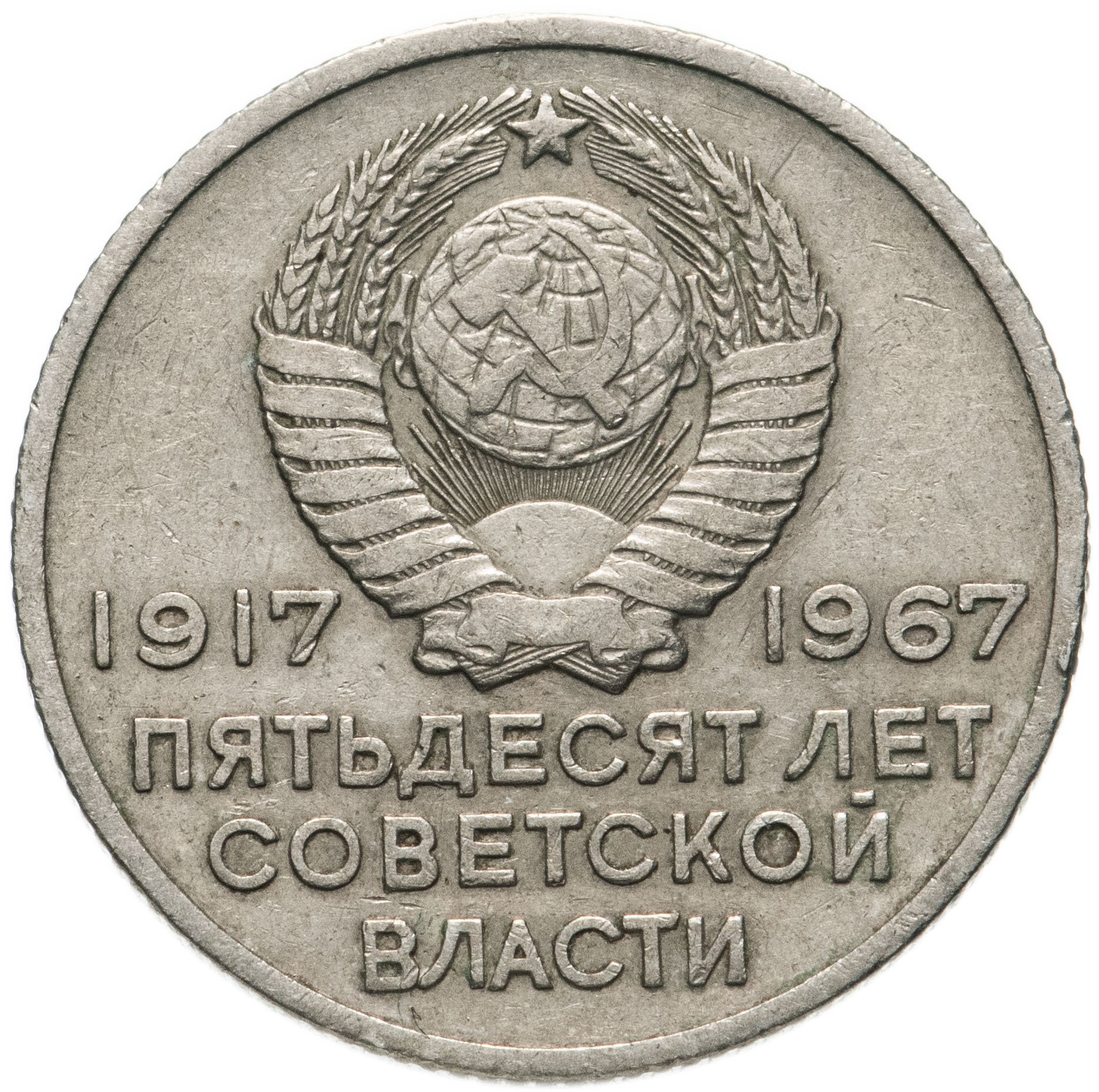 Сверху герб СССР с 15 витками ленты, слева от герба год Великой Октябрьской социалистической революции «1917», справа год выпуска монеты «1967», ниже слова «ПЯТЬДЕСЯТ ЛЕТ СОВЕТСКОЙ ВЛАСТИ».