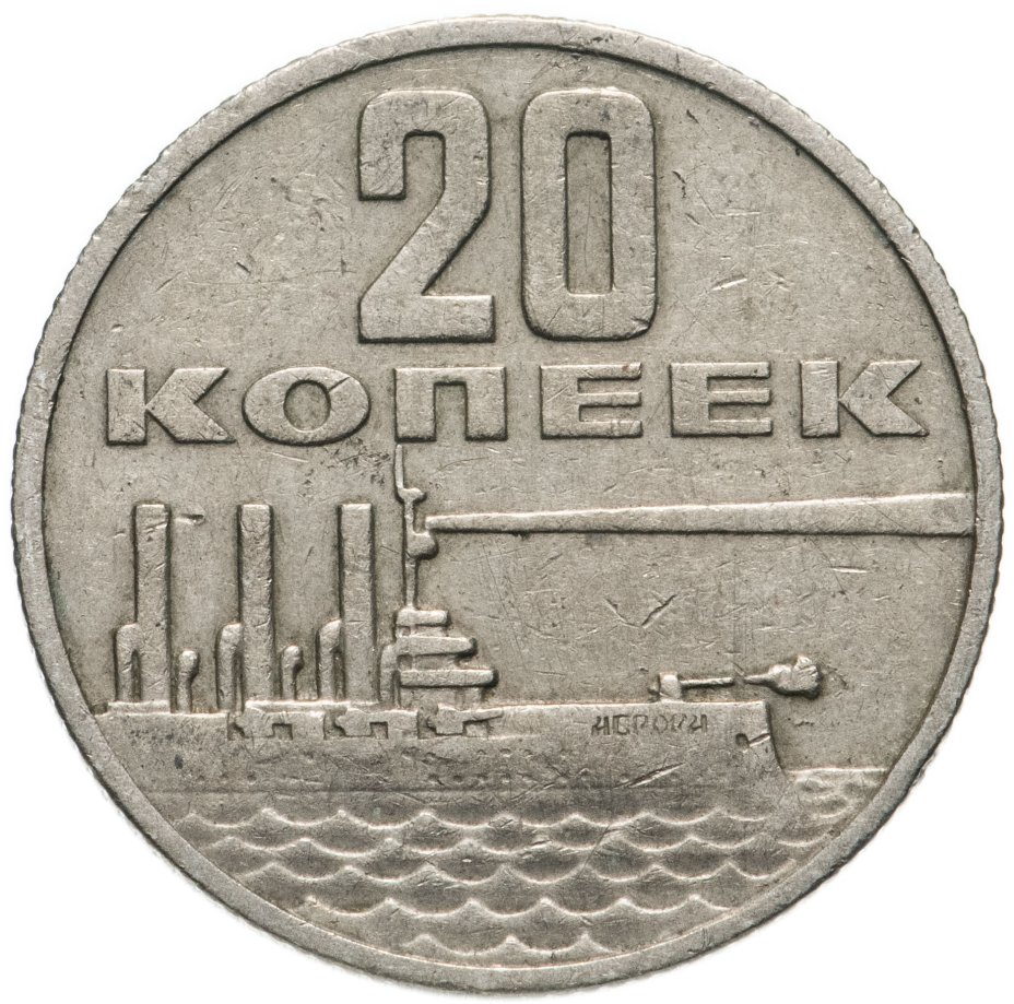 Сверху обозначение достоинства монеты «20» и правее слово «КОПЕЕК», ниже изображение крейсера «Аврора», светящего прожектором вправо.