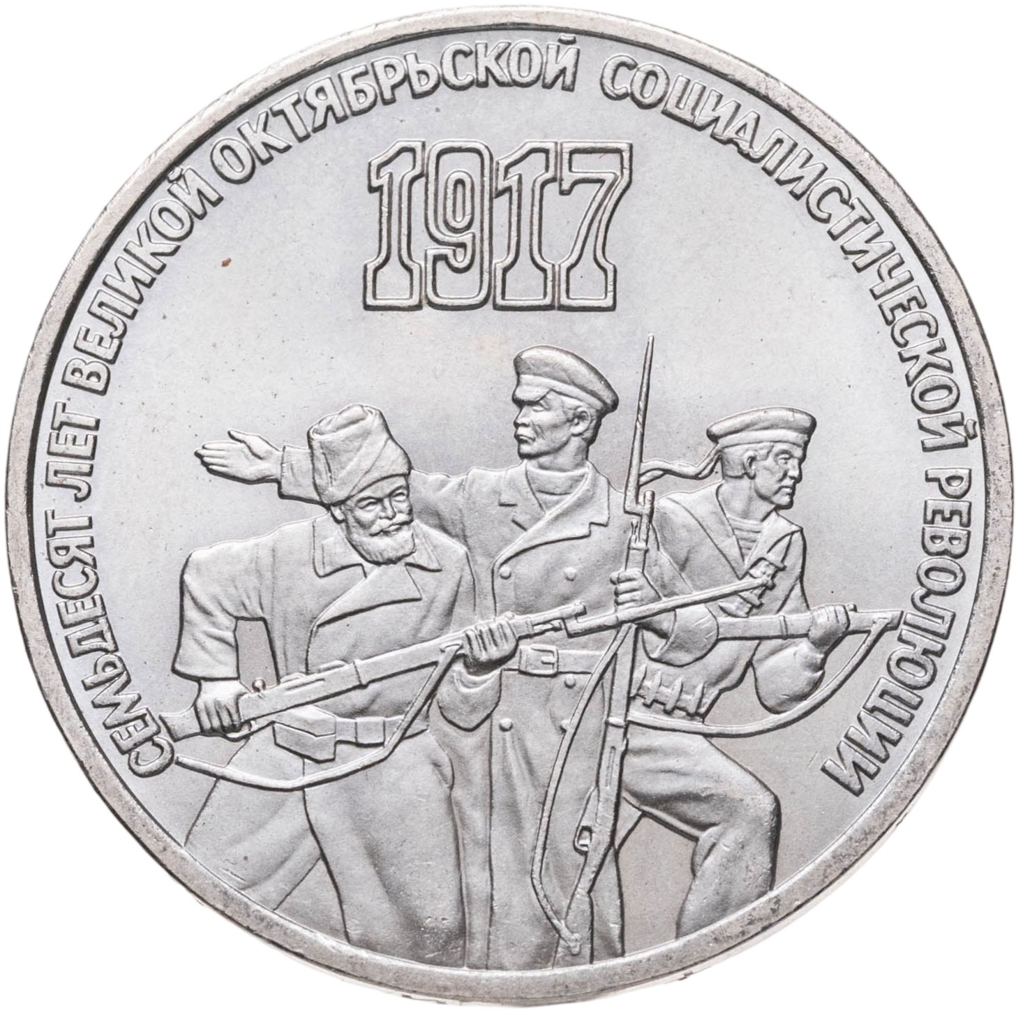 В центре реверса изображены рабочий, солдат и матрос, олицетворяющие собой ведущую силу революции. Рабочий с папахой на голове, в плотно застегнутом тулупе и винтовкой в руках устремлен вперед. Ему вторит матрос. Держащий в руках кортик, он одет в традиционную морскую униформу нижних чинов: бескозырку с лентами и фланелевую рубаху, из-под которой выглядывает тельняшка и матросский воротник форменки. Солдат, находящийся в центре группы, одет в шинель на пуговицах и военную фуражку, призывающим жестом он влечет всех на борьбу за Советскую власть. Над группой полукругом проходит надпись – «70 лет Великой Октябрьской социалистической революции», а в центре год, в который произошло знаменательное событие – 1917.
