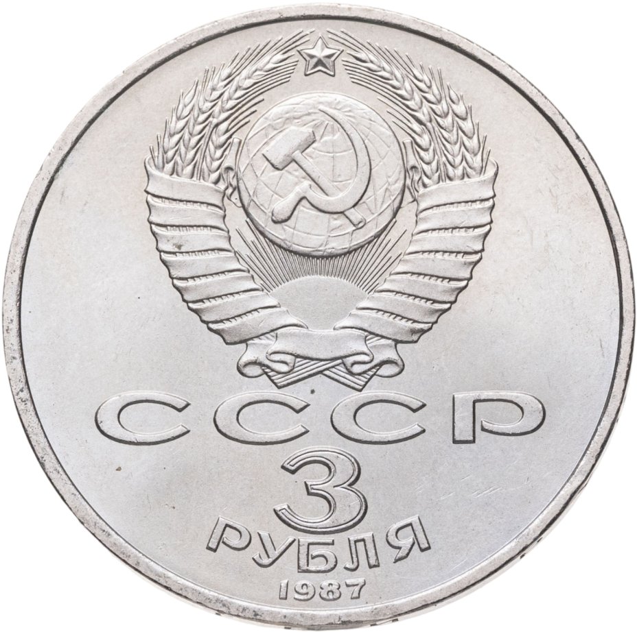 Верхнюю часть аверса монеты занимает герб СССР – серп и молот, символизирующие союз крестьян и рабочих, в знак солидарности с рабочими всей планеты изображены на фоне земного шара в лучах солнца. В нижней части надпись – СССР, затем указание в две строчки номинала монеты – 3 рубля, и находящийся у самого канта, год выпуска монеты.