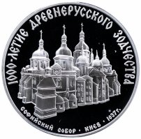 Сверху вдоль канта слова «1000-ЛЕТИЕ ДРЕВНЕРУССКОГО ЗОДЧЕСТВА», в середине изображение Софийского собора в Киеве, внизу вдоль канта слова разделенные точкой «СОФИЙСКИЙ СОБОР», «КИЕВ» и год постройки собора «1037г.».