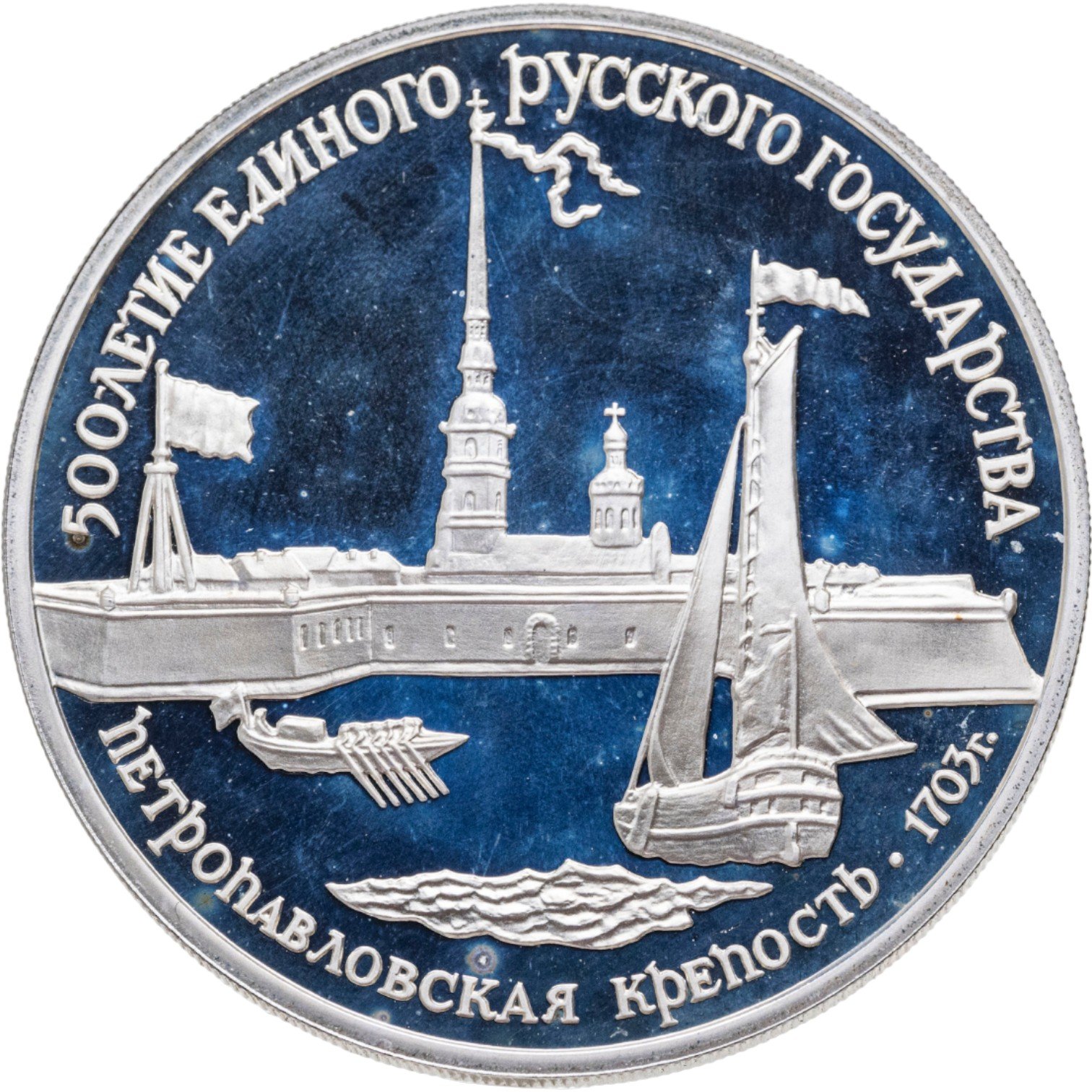 Слева, сверху и справа вдоль канта монеты слова «500-ЛЕТИЕ ЕДИНОГО РУССКОГО ГОСУДАРСТВА», в середине панорама Петропавловской крепости, ниже устье р. Невы, справа линейный корабль, слева галера, внизу вдоль канта разделенные точкой слова «ПЕТРОПАВЛОВСКАЯ КРЕПОСТЬ» и год постройки «1703г.».