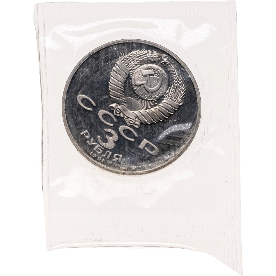 Сверху герб СССР с 15 витками ленты, под ним буквы «СССР», ниже обозначение достоинства монеты цифра «3» и ниже слово «РУБЛЯ», внизу у канта год выпуска монеты «1991».
