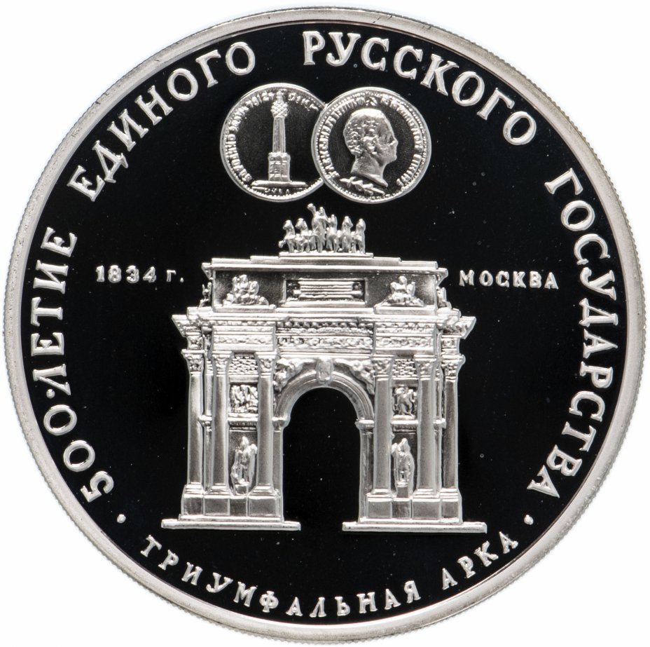 Слева, сверху и справа вдоль канта монеты слова «500-ЛЕТИЕ ЕДИНОГО РУССКОГО ГОСУДАРСТВА», сверху аверс и реверс памятной монеты «Открытие памятника императору Александру I в Санкт-Петербурге» 1834 г., ниже Триумфальная арка, слева год «1834 г.», справа слово «Москва», внизу вдоль канта слова «ТРИУМФАЛЬНАЯ АРКА».