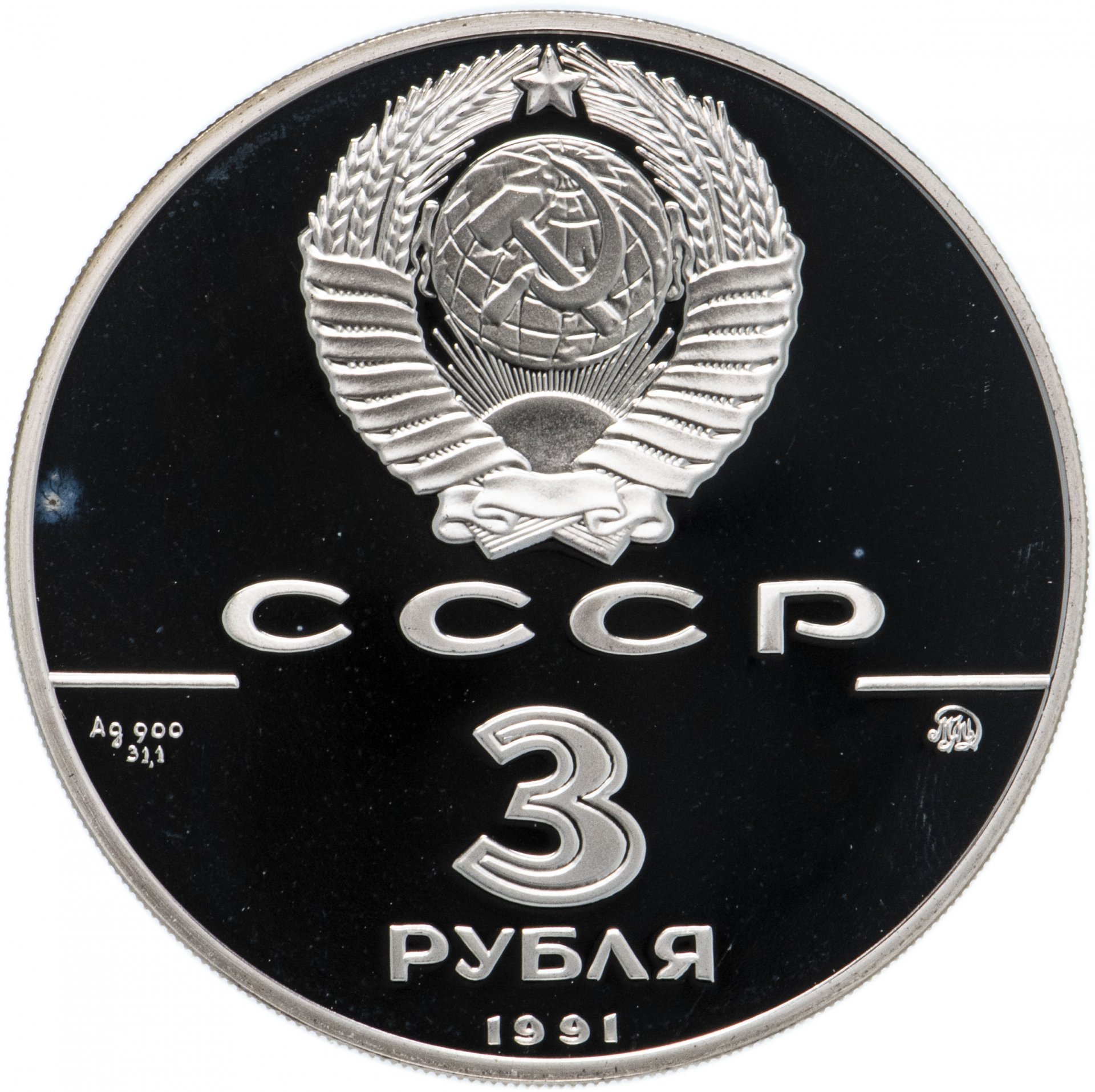 Сверху герб СССР с 15 витками ленты, под ним буквы «СССР», ниже слева и справа черта, под чертой слева химическое обозначение «Ag» и проба «900» металла из которого сделана монета, под ними чистый вес драгоценного металла «31,1», под чертой справа монограмма монетного двора «ММД», ниже обозначение достоинства монеты цифра «3» и ниже слово «РУБЛЯ», внизу у канта год выпуска монеты «1991».
