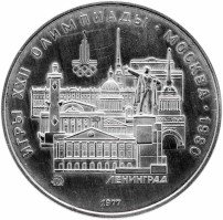 Слева и сверху вдоль канта слова «ИГРЫ XXII ОЛИМПИАДЫ», справа разделенные точкой слово «МОСКВА» и год проведения XXII Олимпиады «1980», вверху слева эмблема XXII Олимпийских игр, в середине панорама Ленинграда, под ней слева монограмма монетного двора «ММД», внизу у канта год выпуска монеты «1977».