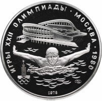 Слева и сверху вдоль канта слова «ИГРЫ XXII ОЛИМПИАДЫ», справа разделенные точкой слово «МОСКВА» и год проведения XXII Олимпиады «1980», сверху плавательный бассейн «Олимпийский», ниже пловец, под ним слева эмблема XXII Олимпийских игр, справа монограмма монетного двора «ЛМД», внизу у канта год выпуска монеты «1978».