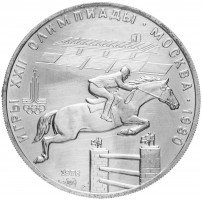 Слева и сверху вдоль канта слова «ИГРЫ XXII ОЛИМПИАДЫ», справа разделенные точкой слово «МОСКВА» и год проведения XXII Олимпиады «1980», слева эмблема XXII Олимпийских игр, в середине всадник, преодолевающий препятствие, за ним конно-спортивный комплекс, под всадником год выпуска монеты «1978» и ниже монограмма монетного двора «ЛМД».