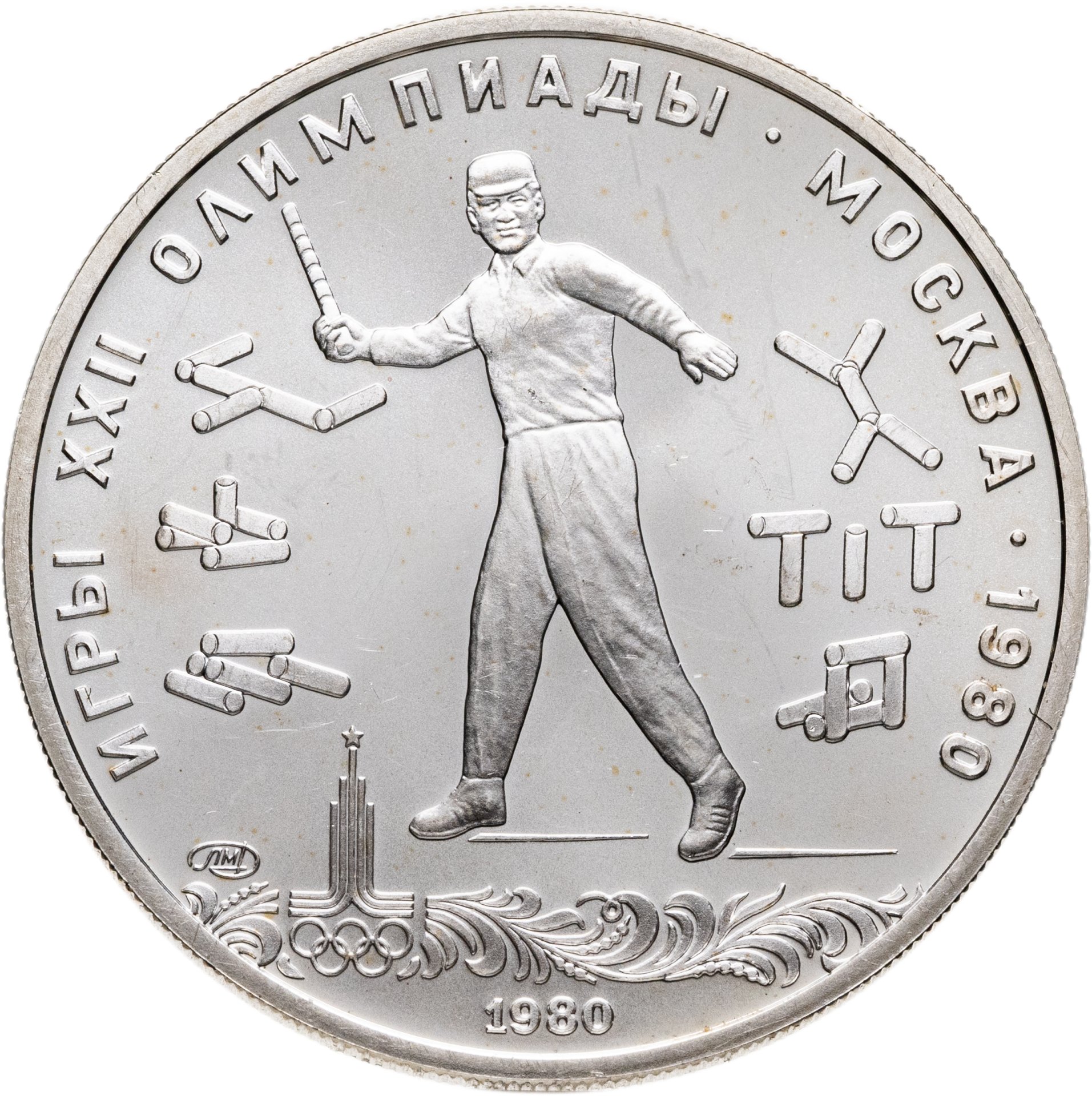 Слева и сверху вдоль канта слова «ИГРЫ XXII ОЛИМПИАДЫ», справа разделенные точкой слово «МОСКВА» и год проведения XXII Олимпиады «1980», в середине спортсмен, метающий городошную биту, слева и справа от него - фигуры городков, внизу слева монограмма монетного двора «ЛМД» и эмблема XXII Олимпийских игр, внизу у канта год выпуска монеты «1980».