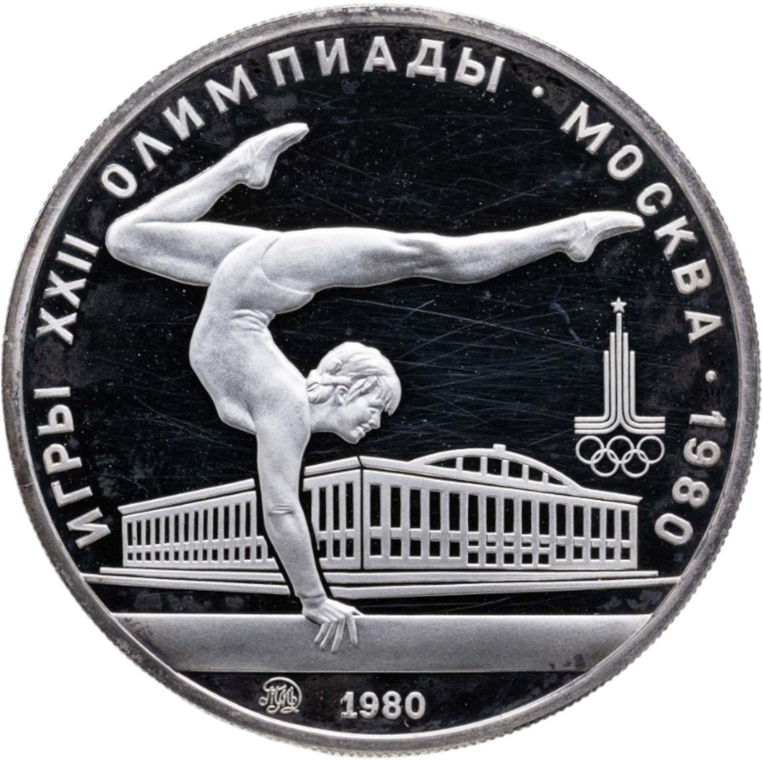 Слева и сверху вдоль канта слова «ИГРЫ XXII ОЛИМПИАДЫ», справа разделенные точкой слово «МОСКВА» и год проведения XXII Олимпиады «1980», в середине гимнастка, выполняющая акробатический элемент, за ней Ледовый дворец стадиона им. В.И. Ленина (Лужники), справа эмблема XXII Олимпийских игр, внизу у канта слева монограмма монетного двора «ММД», справа год выпуска монеты «1980».