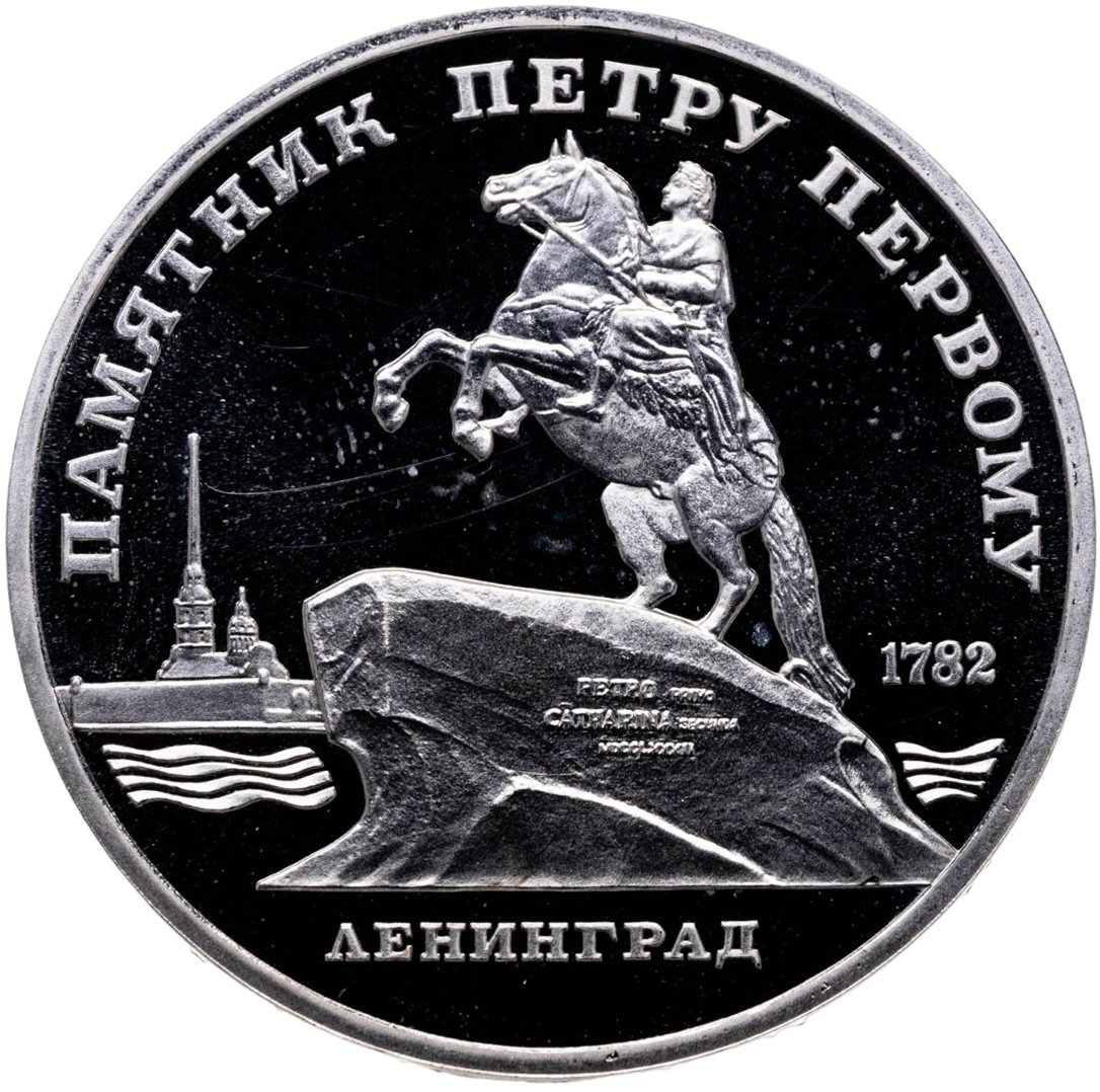 В центре памятник Петру Первому в Ленинграде на фоне силуэта Петропавловской крепости. Под ним надпись «ЛЕНИНГРАД». Справа от памятника дата «1782». Вверху вдоль внешнего ободка монеты полукругом надпись «ПАМЯТНИК ПЕТРУ ПЕРВОМУ».