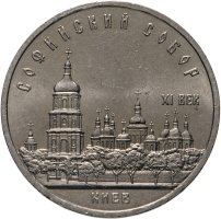 Софийскому собору в Киеве посвящена монета 5 рублей, вышедшая в 1988 году в СССР. Это юбилейная монета, которую можно купить как отдельно на этой странице, так и в составе набора юбилейных монет СССР. На монетах часто чеканятся изображения на исторические темы, и киевский Софийский собор, имеющий многовековую историю, подходит сюда как нельзя лучше.