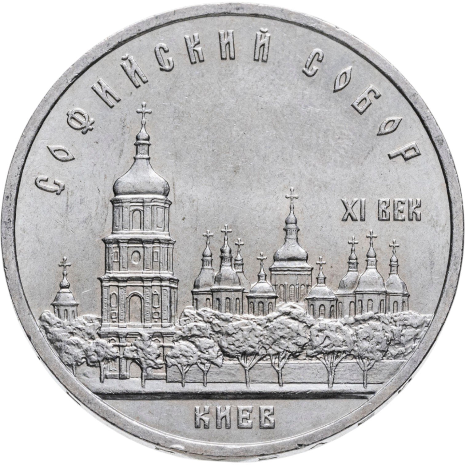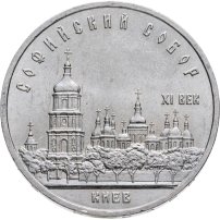 Софийскому собору в Киеве посвящена монета 5 рублей, вышедшая в 1988 году в СССР. Это юбилейная монета, которую можно купить как отдельно на этой странице, так и в составе набора юбилейных монет СССР. На монетах часто чеканятся изображения на исторические темы, и киевский Софийский собор, имеющий многовековую историю, подходит сюда как нельзя лучше.
