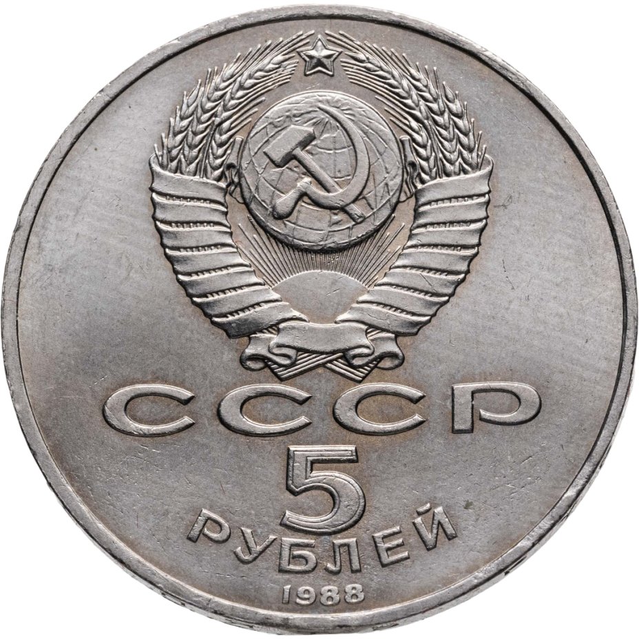 Сверху герб СССР с 15 витками ленты, под ним буквы «СССР», ниже обозначение достоинства монеты цифра «5» и ниже слово «РУБЛЕЙ», внизу у канта год выпуска монеты «1988».
