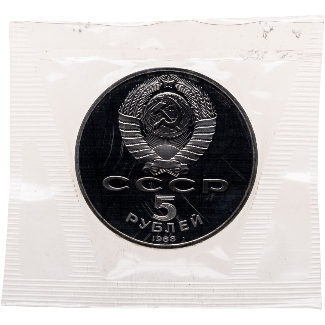 Сверху герб СССР с 15 витками ленты, под ним буквы «СССР», ниже обозначение достоинства монеты цифра «5» и ниже слово «РУБЛЕЙ», внизу у канта год выпуска монеты «1988».