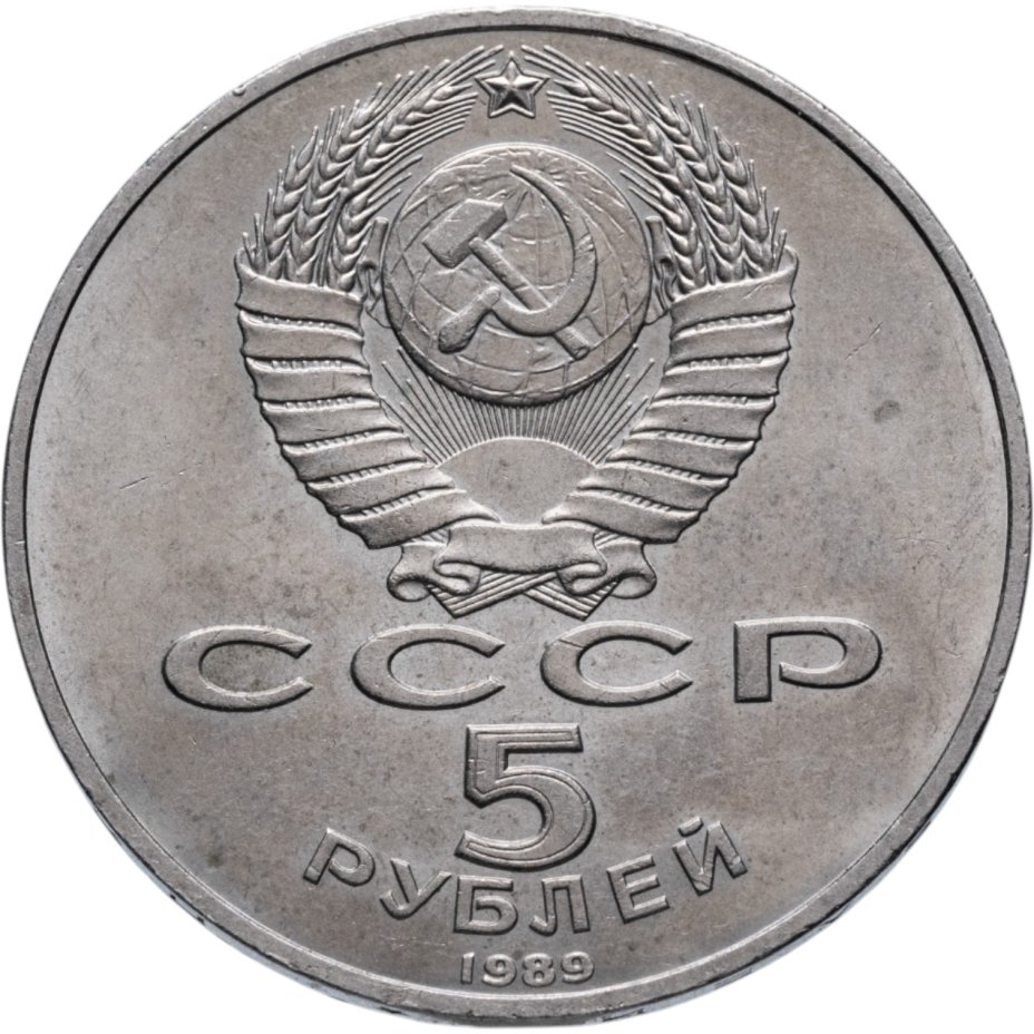 Сверху герб СССР с 15 витками ленты, под ним буквы «СССР», ниже обозначение достоинства монеты цифра «5» и ниже слово «РУБЛЕЙ», внизу у канта год выпуска монеты «1989».