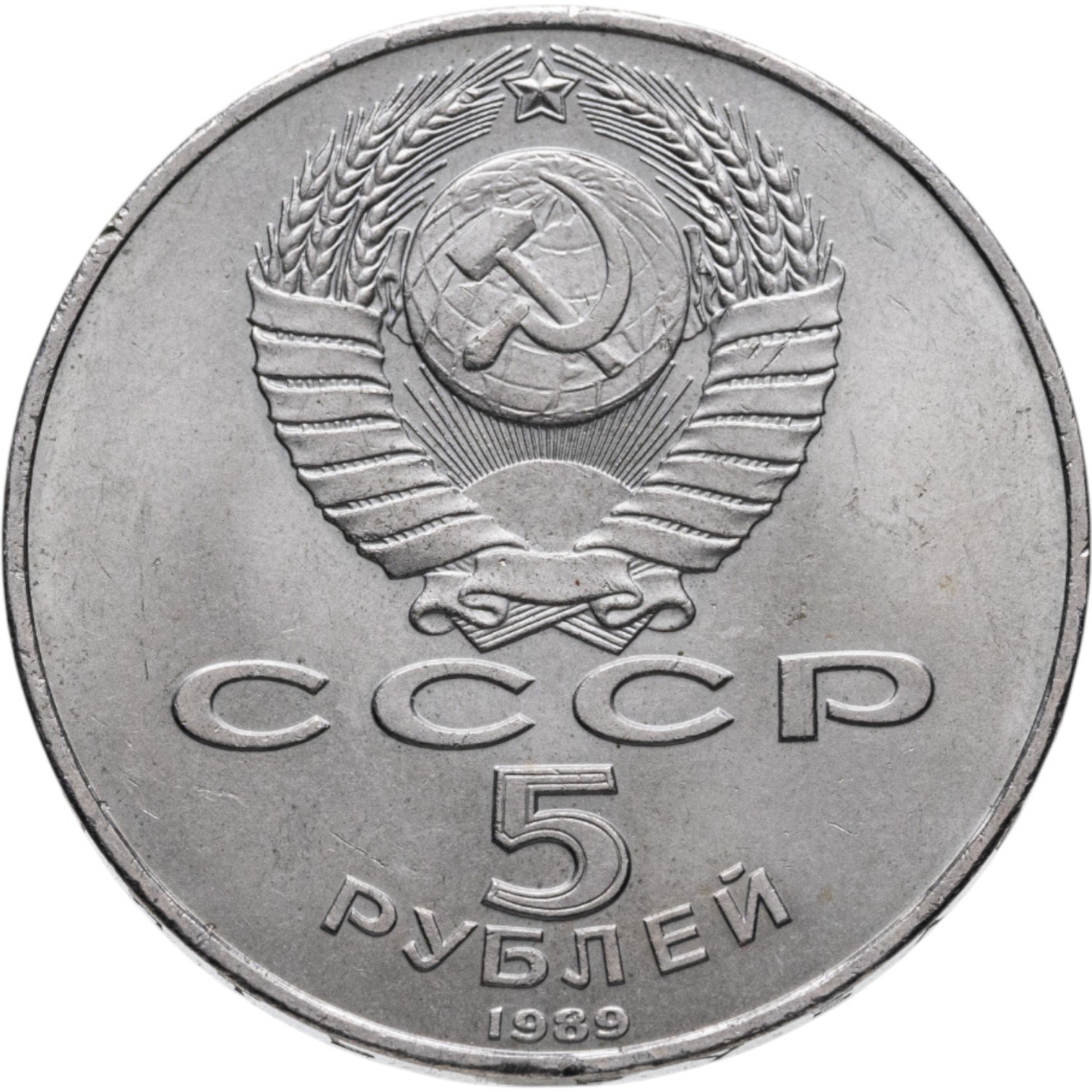 Сверху герб СССР с 15 витками ленты, под ним буквы «СССР», ниже обозначение достоинства монеты цифра «5» и ниже слово «РУБЛЕЙ», внизу у канта год выпуска монеты «1989».