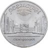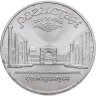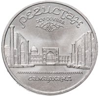 В 1988 году Госбанк СССР начал чеканить пятирублёвые монеты, посвящённые памятникам и соборам союзных республик. До 1991 года в серии успело выйти всего 12 монет: 3 – с памятниками, 3 – со старинными и красивейшими зданиями, и 6 – с соборами и храмами разных концессий. Монета, посвящённая храмовому комплексу на главной площади Самарканда, Регистан, была выпущена в 1989.