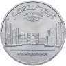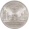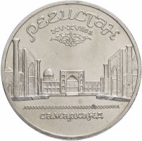 В 1988 году Госбанк СССР начал чеканить пятирублёвые монеты, посвящённые памятникам и соборам союзных республик. До 1991 года в серии успело выйти всего 12 монет: 3 – с памятниками, 3 – со старинными и красивейшими зданиями, и 6 – с соборами и храмами разных концессий. Монета, посвящённая храмовому комплексу на главной площади Самарканда, Регистан, была выпущена в 1989.