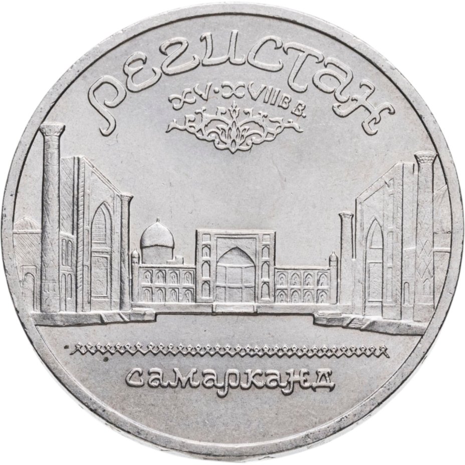 В 1988 году Госбанк СССР начал чеканить пятирублёвые монеты, посвящённые памятникам и соборам союзных республик. До 1991 года в серии успело выйти всего 12 монет: 3 – с памятниками, 3 – со старинными и красивейшими зданиями, и 6 – с соборами и храмами разных концессий. Монета, посвящённая храмовому комплексу на главной площади Самарканда, Регистан, была выпущена в 1989.