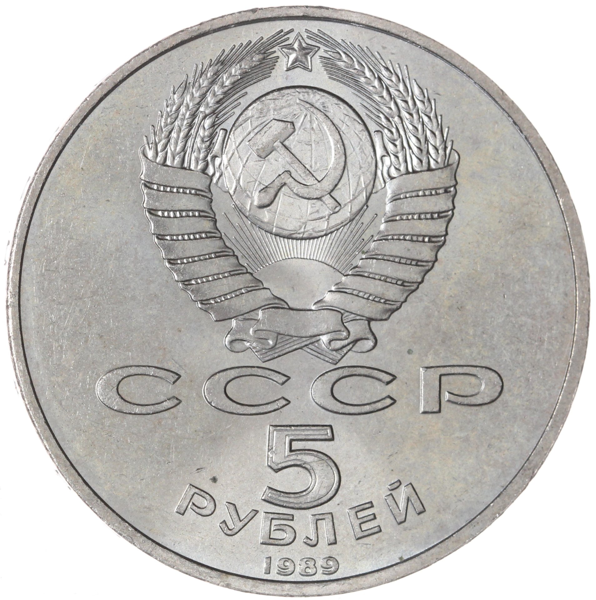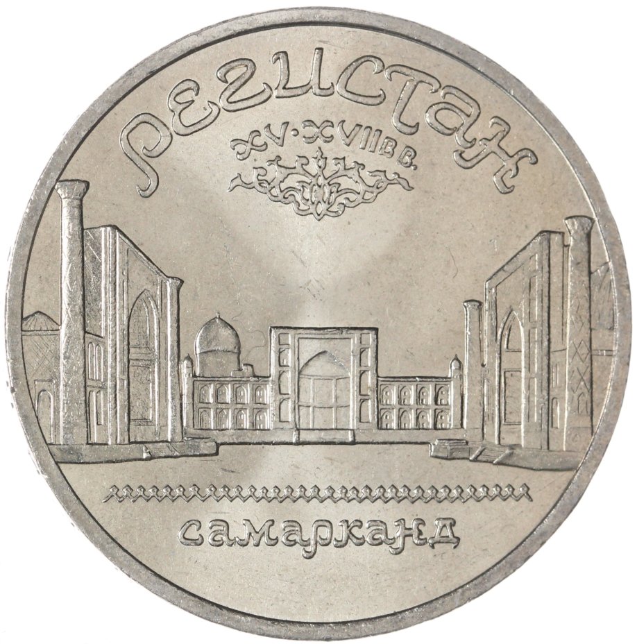 В 1988 году Госбанк СССР начал чеканить пятирублёвые монеты, посвящённые памятникам и соборам союзных республик. До 1991 года в серии успело выйти всего 12 монет: 3 – с памятниками, 3 – со старинными и красивейшими зданиями, и 6 – с соборами и храмами разных концессий. Монета, посвящённая храмовому комплексу на главной площади Самарканда, Регистан, была выпущена в 1989.