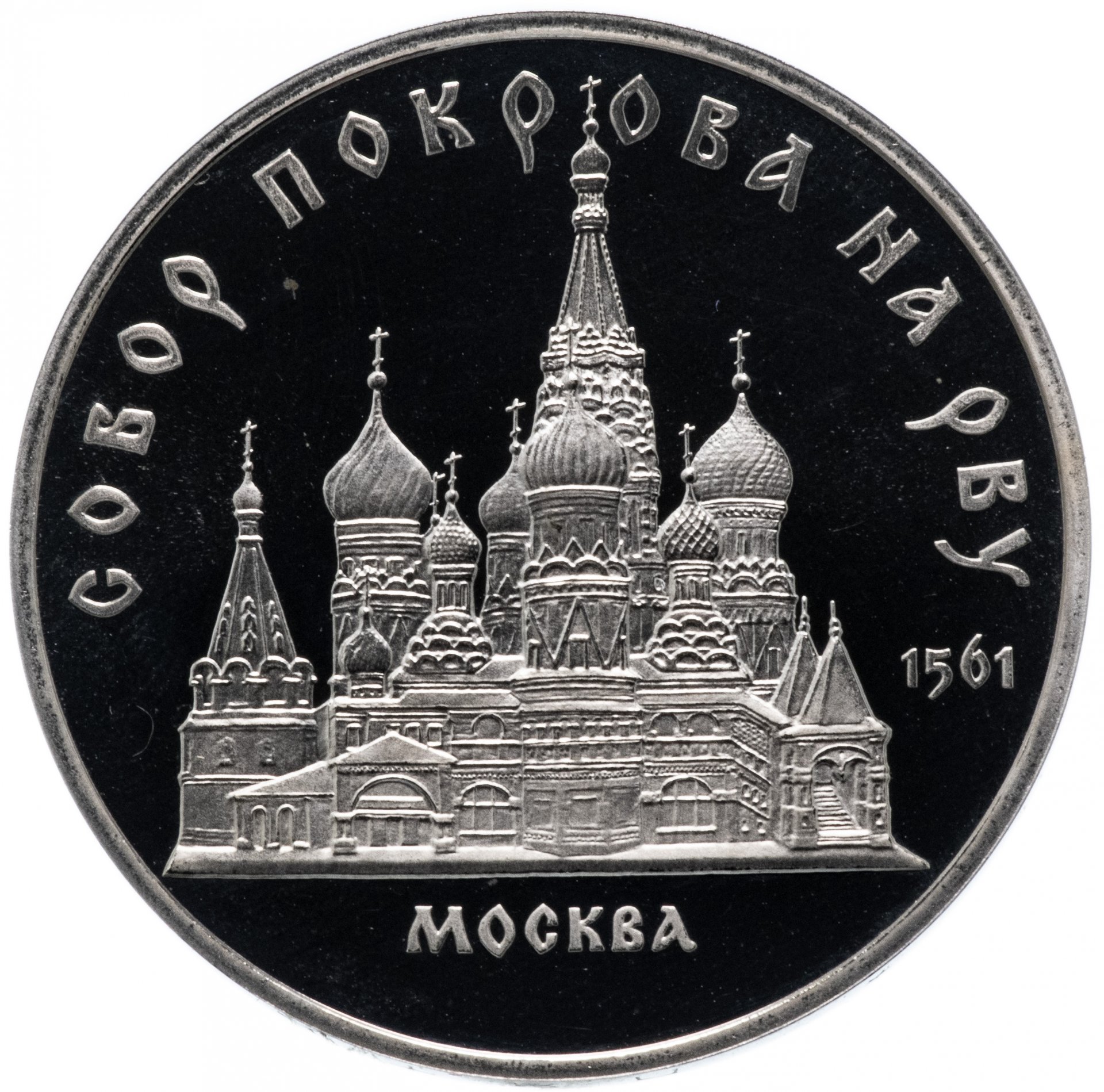 В центре изображение собора Покрова на рву на Красной площади в Москве. Под ним надпись «МОСКВА». Справа дата «1561». Вверху вдоль внешнего ободка монеты полукругом надпись «СОБОР ПОКРОВА НА РВУ».