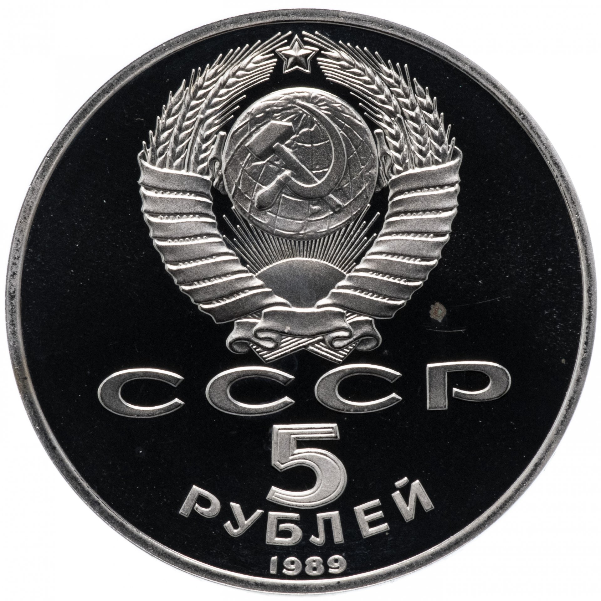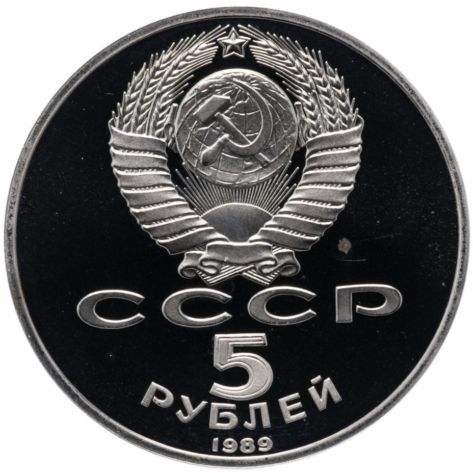 Сверху герб СССР с 15 витками ленты, под ним буквы «СССР», ниже обозначение достоинства монеты цифра «5» и ниже слово «РУБЛЕЙ», внизу у канта год выпуска монеты «1989».
