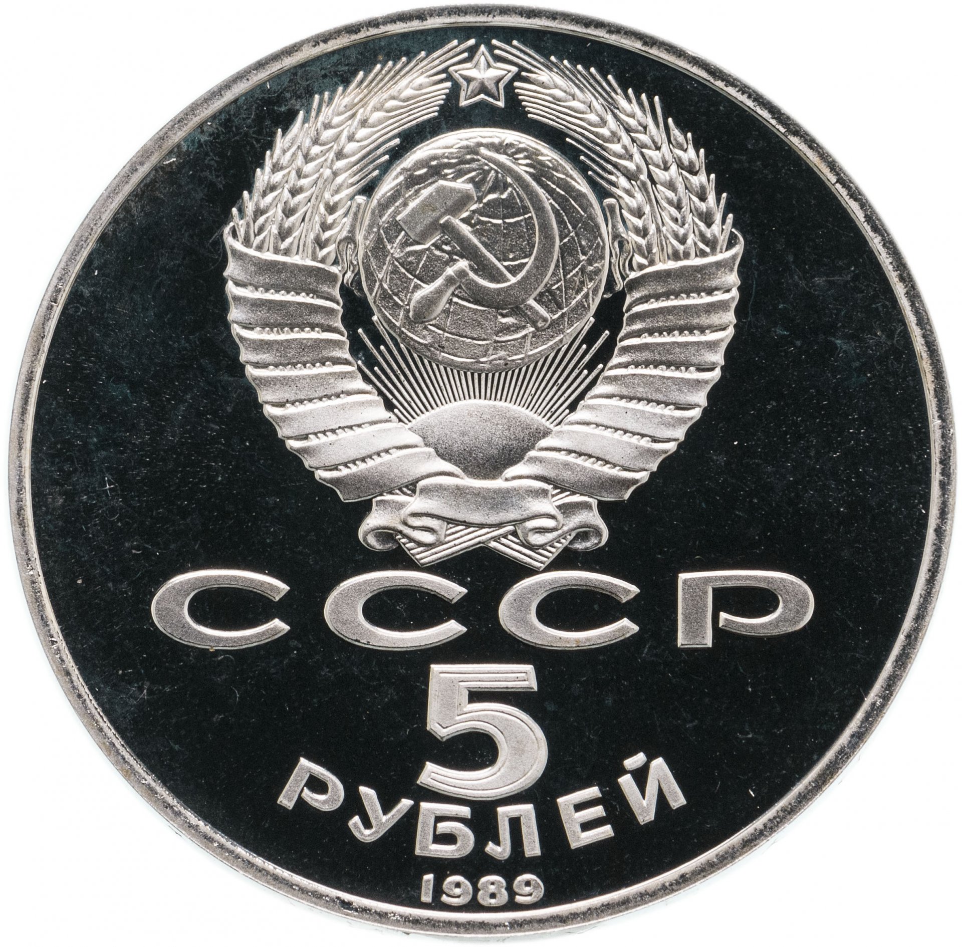 Сверху герб СССР с 15 витками ленты, под ним буквы «СССР», ниже обозначение достоинства монеты цифра «5» и ниже слово «РУБЛЕЙ», внизу у канта год выпуска монеты «1989».