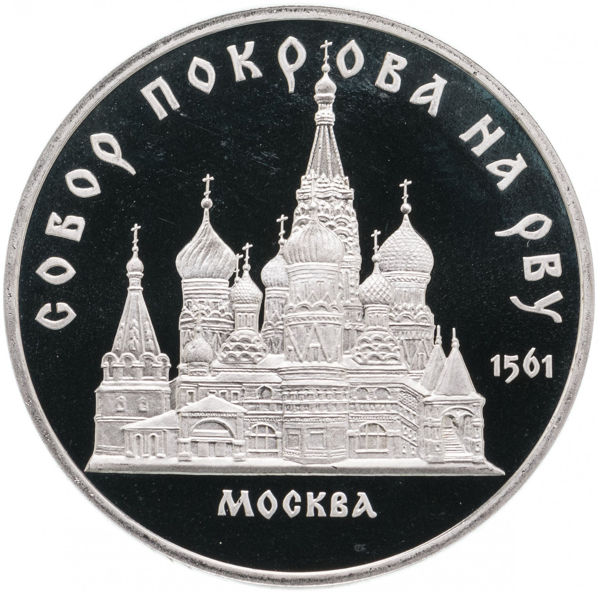 В центре изображение собора Покрова на рву на Красной площади в Москве. Под ним надпись «МОСКВА». Справа дата «1561». Вверху вдоль внешнего ободка монеты полукругом надпись «СОБОР ПОКРОВА НА РВУ».