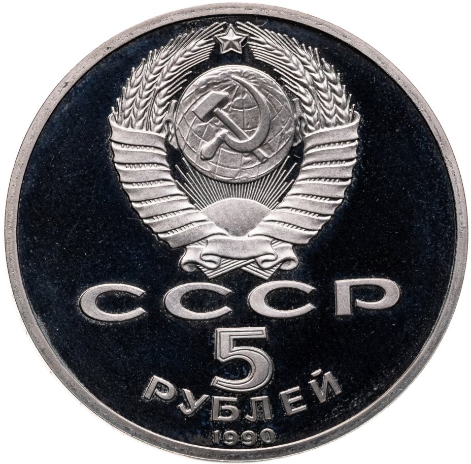 Сверху герб СССР с 15 витками ленты, под ним буквы «СССР», ниже обозначение достоинства монеты цифра «5» и ниже слово «РУБЛЕЙ», внизу у канта год выпуска монеты «1990».