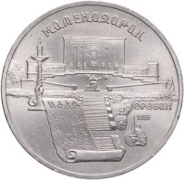 Сразу под гербом аббревиатура государства – СССР, под которой находится, размещенный в две строчки, достоинство монеты – «5 рублей», у самого канта – расположен год выпуска – 1990. Гурт монеты содержит двукратно повторяющуюся надпись номинала, разделенную звездами.