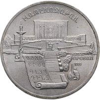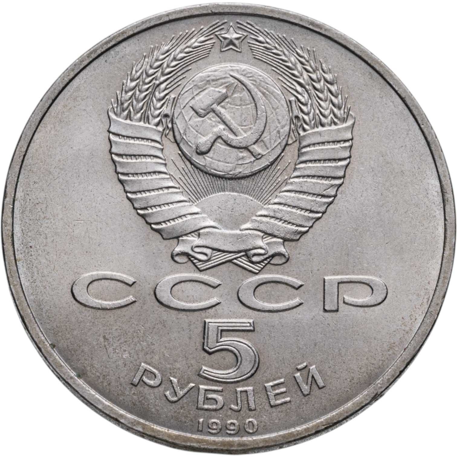 Сразу под гербом аббревиатура государства – СССР, под которой находится, размещенный в две строчки, достоинство монеты – «5 рублей», у самого канта – расположен год выпуска – 1990. Гурт монеты содержит двукратно повторяющуюся надпись номинала, разделенную звездами.