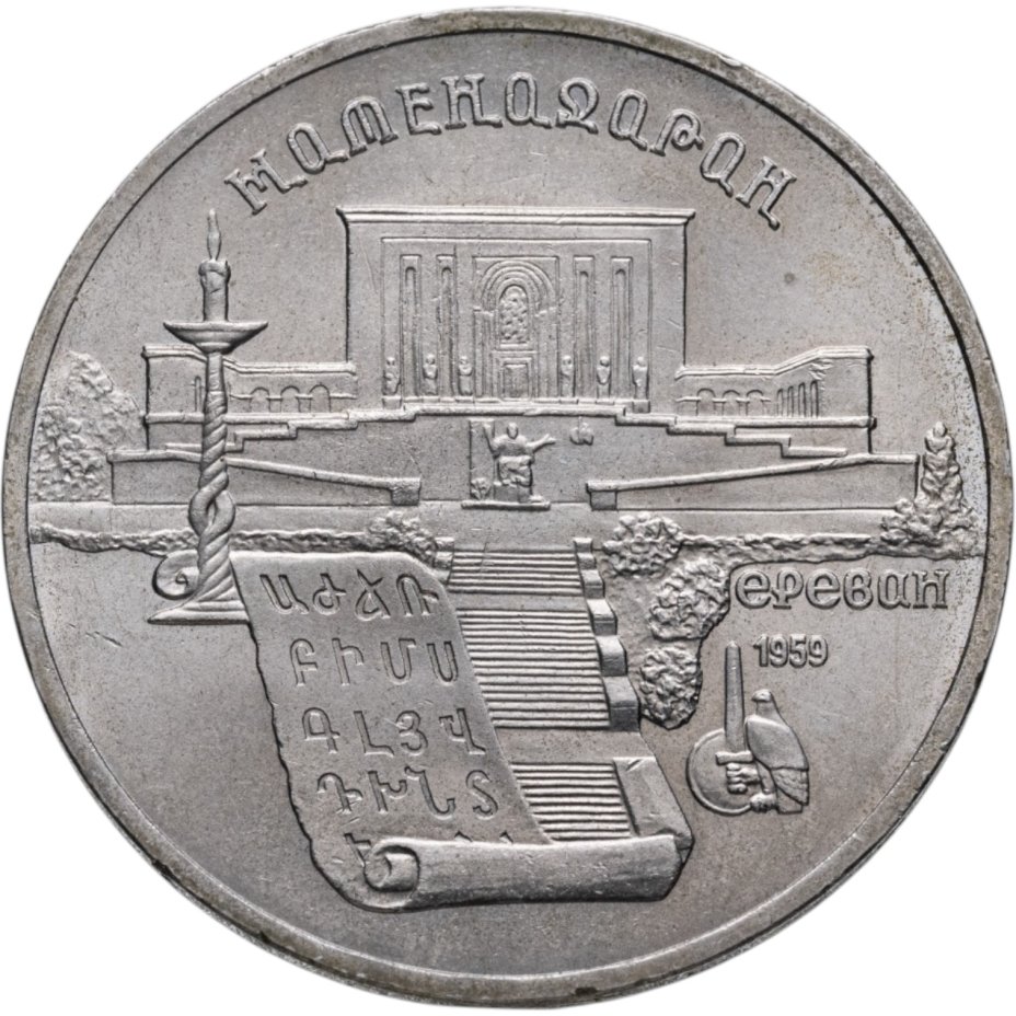 Памятная мельхиоровая монета диаметром 35 мм, весом 2,6 г была выпущена Госбанком СССР в 1990 году тиражом в 2, млн. экземпляров. Монета, оформлением которой занимались художник А.А. Колодкин и скульптор Н.А. Носов, была приурочена к годовщине создания института рукописей в Ереване.