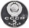 Сразу под гербом аббревиатура государства – СССР, под которой находится, размещенный в две строчки, достоинство монеты – «5 рублей», у самого канта – расположен год выпуска – 1990. Гурт монеты содержит двукратно повторяющуюся надпись номинала, разделенную звездами.