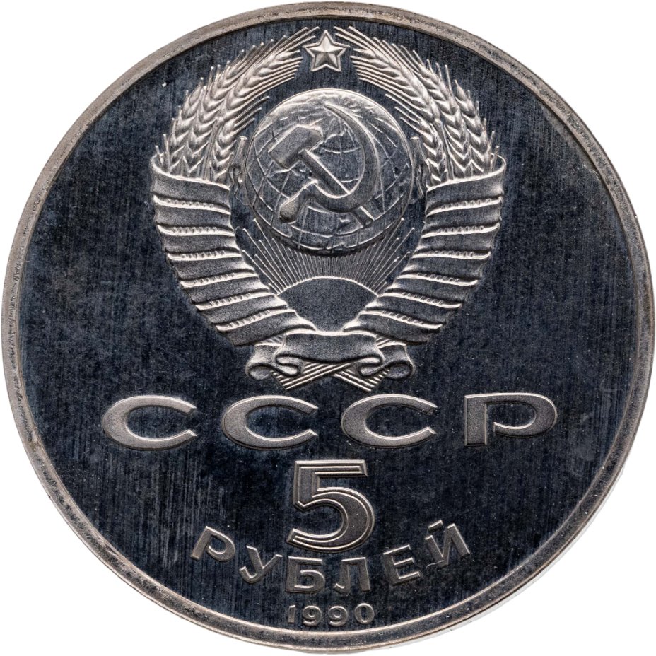 Сразу под гербом аббревиатура государства – СССР, под которой находится, размещенный в две строчки, достоинство монеты – «5 рублей», у самого канта – расположен год выпуска – 1990. Гурт монеты содержит двукратно повторяющуюся надпись номинала, разделенную звездами.