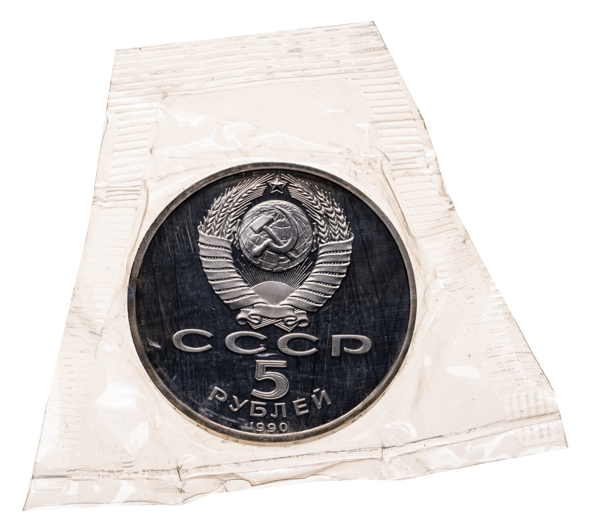Сверху герб СССР с 15 витками ленты, под ним буквы «СССР», ниже обозначение достоинства монеты цифра «5» и ниже слово «РУБЛЕЙ», внизу у канта год выпуска монеты «1990».