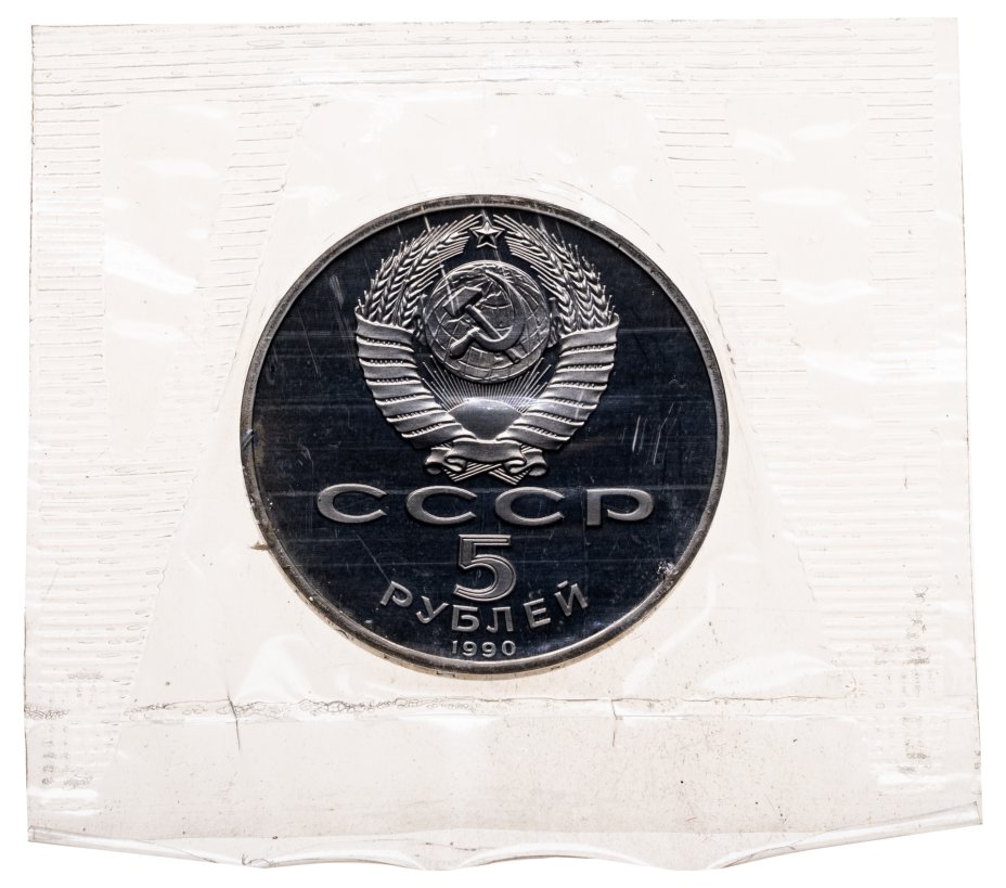 Сверху герб СССР с 15 витками ленты, под ним буквы «СССР», ниже обозначение достоинства монеты цифра «5» и ниже слово «РУБЛЕЙ», внизу у канта год выпуска монеты «1990».