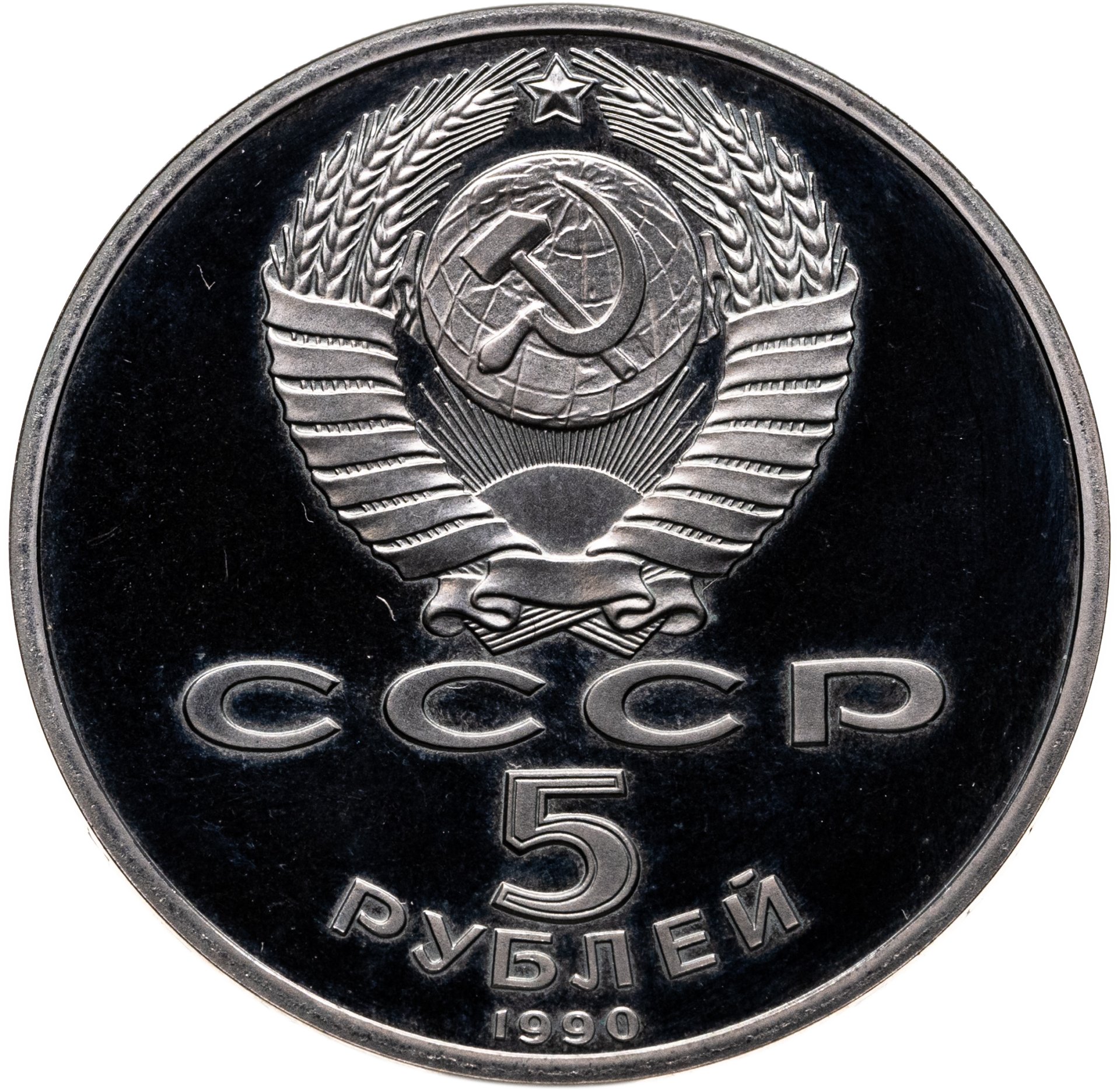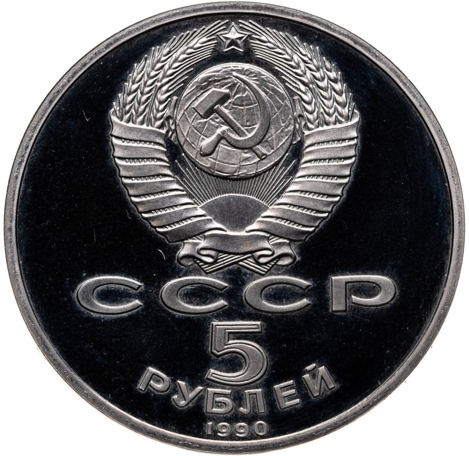 Сверху герб СССР с 15 витками ленты, под ним буквы «СССР», ниже обозначение достоинства монеты цифра «5» и ниже слово «РУБЛЕЙ», внизу у канта год выпуска монеты «1990».