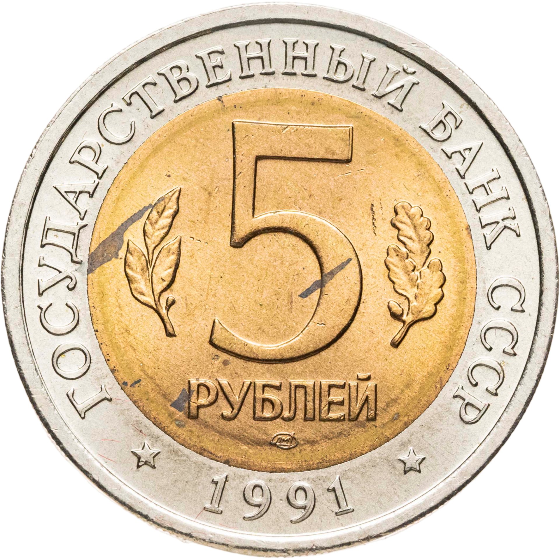 сверху вдоль края монеты слова «ГОСУДАРСТВЕННЫЙ БАНК СССР», внизу год чеканки «1991», в середине номинал «5», слева - лавровая ветвь, справа - дубовая ветвь, ниже слово «РУБЛЕЙ», ниже монограмма монетного двора «ЛМД».