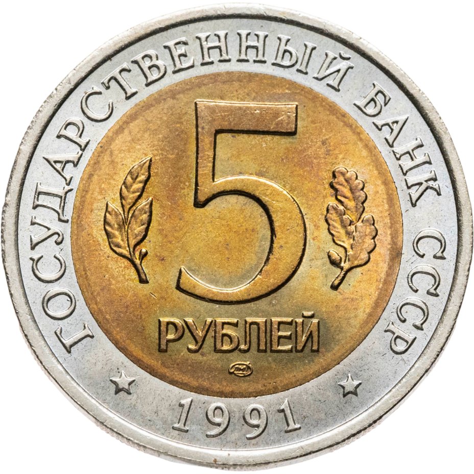 сверху вдоль края монеты слова «ГОСУДАРСТВЕННЫЙ БАНК СССР», внизу год чеканки «1991», в середине номинал «5», слева - лавровая ветвь, справа - дубовая ветвь, ниже слово «РУБЛЕЙ», ниже монограмма монетного двора «ЛМД».